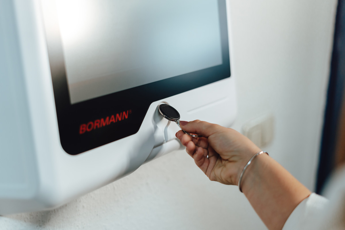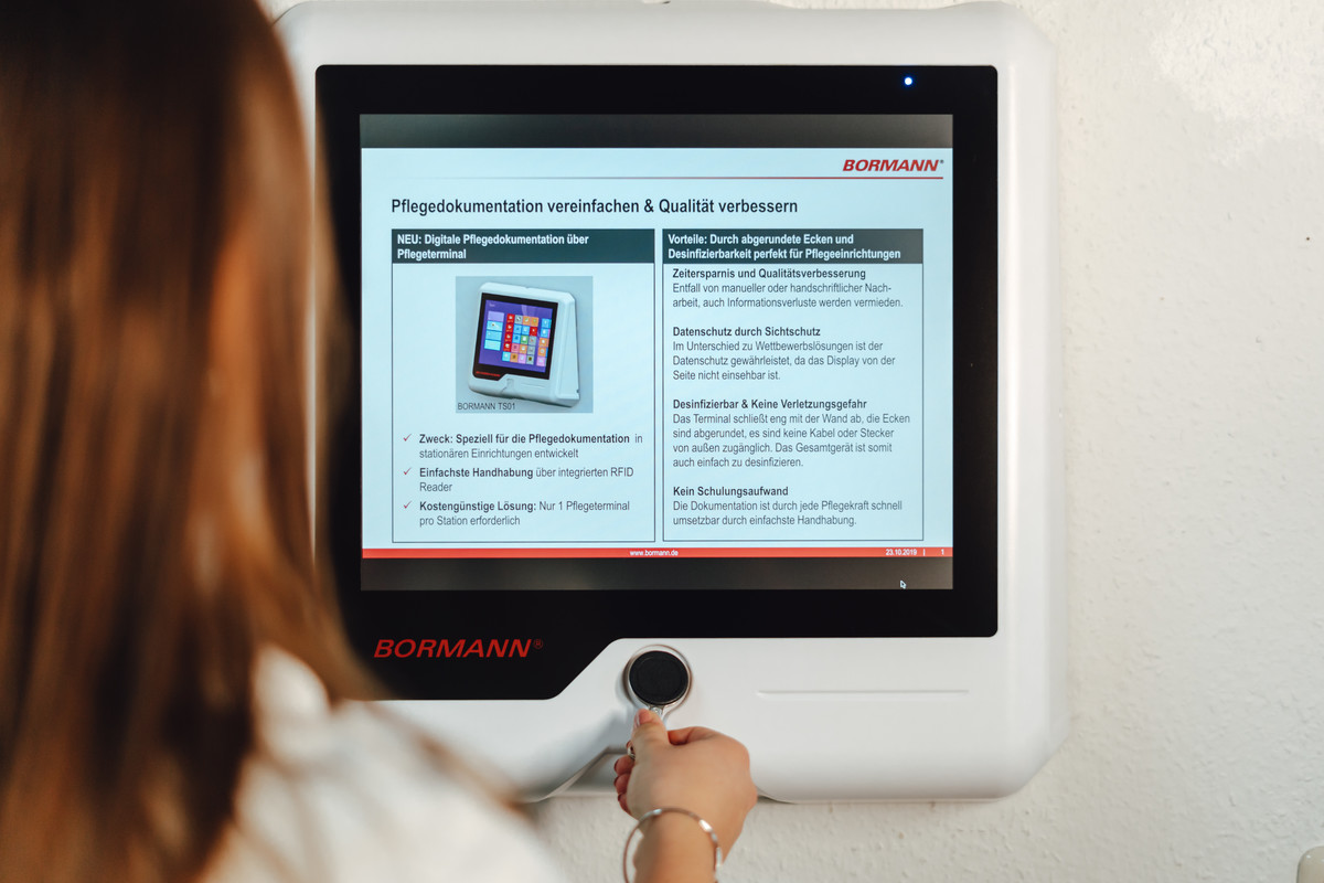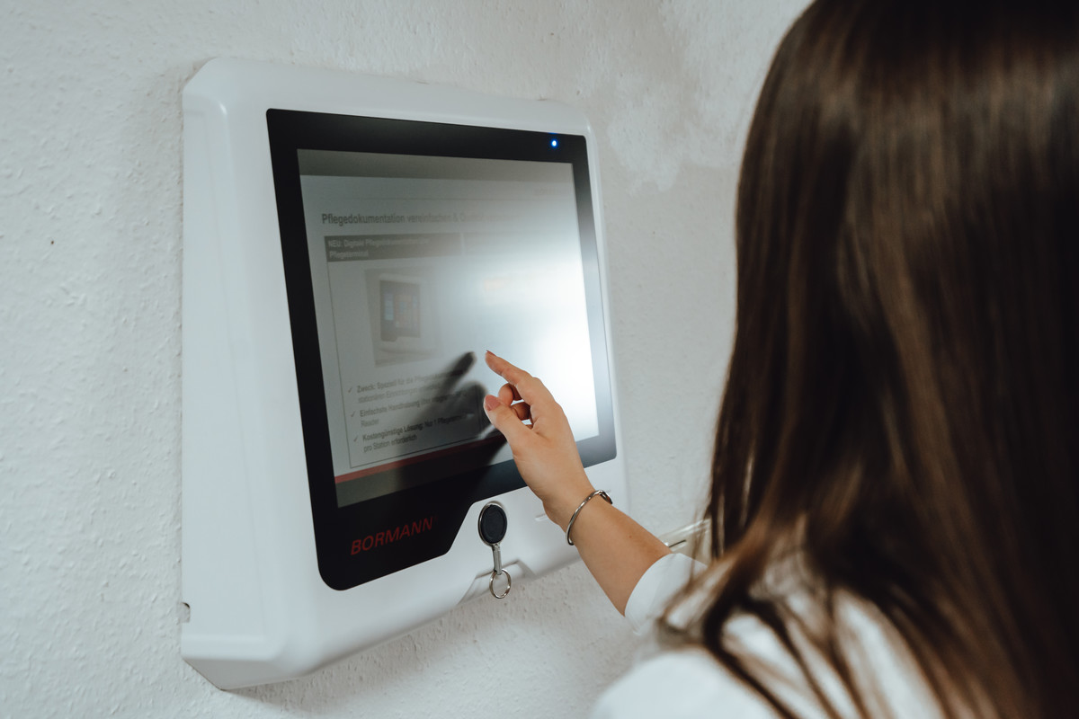 Das moderne Design sichert die einfache Bedienbarkeit und passt sich an die Umgebung im Pflegeheim perfekt an. Das Client-Monitor System kann schnell und einfach desinfiziert bzw. abgewischt werden. Durch das abgerundete Gehäuse und dem extrem flachen Anliegen an der Wand wird ein Hängenbleiben oder ein schmerzhaftes Anstoßen nahezu ausgeschlossen. Mittels des im Gehäuse integrierten RFID Reader und einem codierten RFID Chip kann sich nur das berechtige Personal am System anmelden.